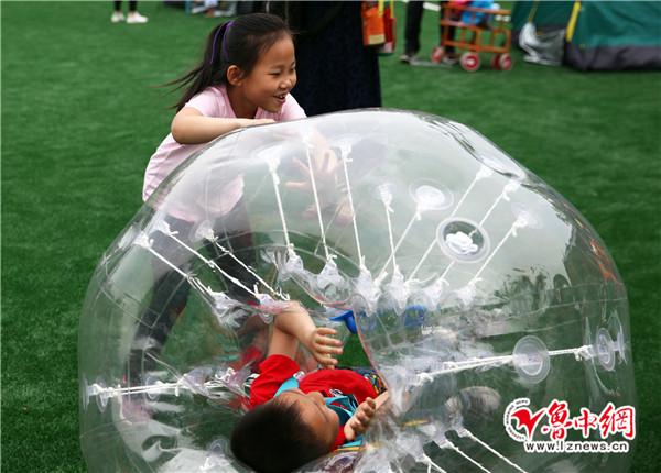 来游玩的小朋友们在进行“气泡足球”游戏的挑战