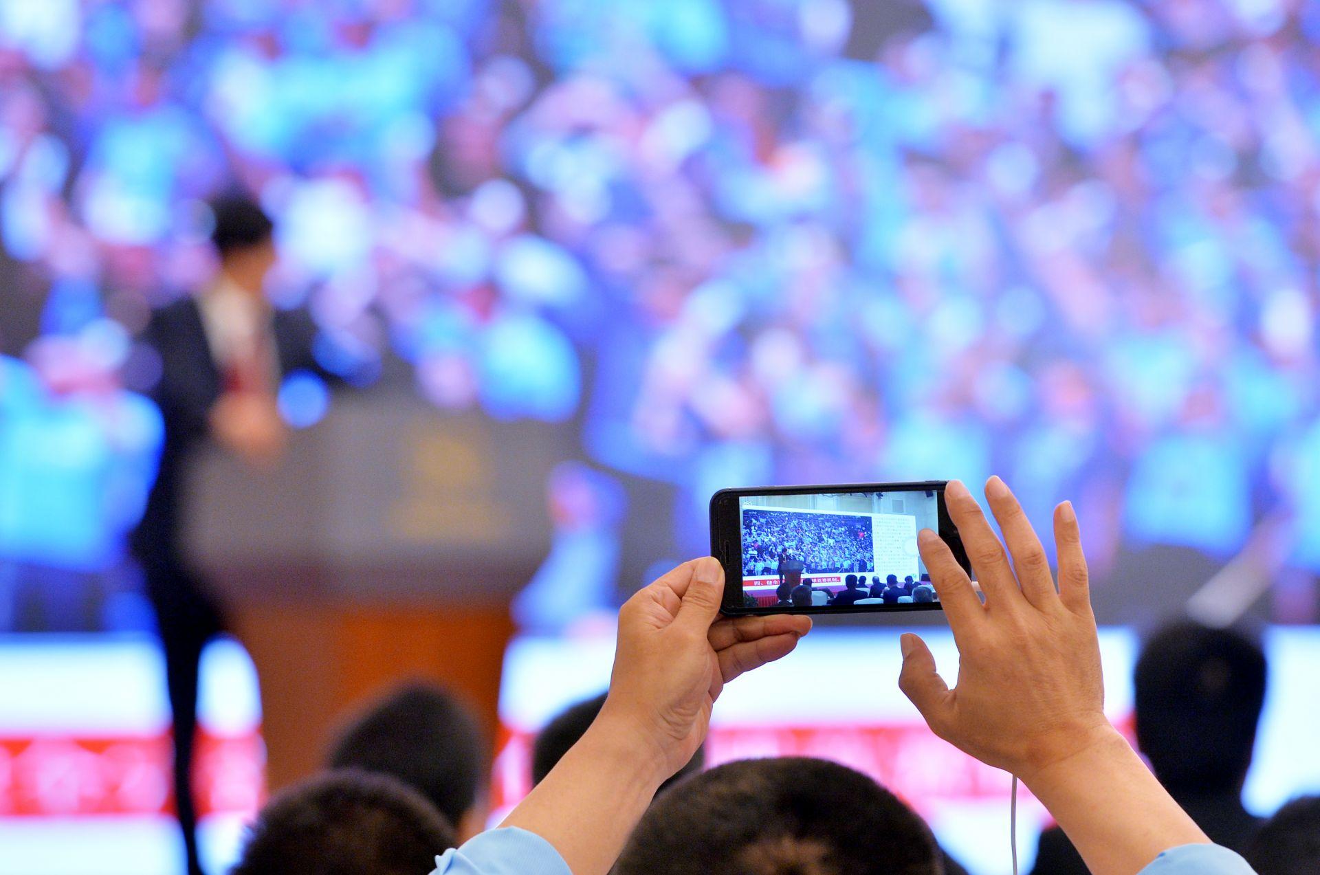 与会代表手机拍摄大屏上的先进单位的宝贵经验。记者喻志勇 摄