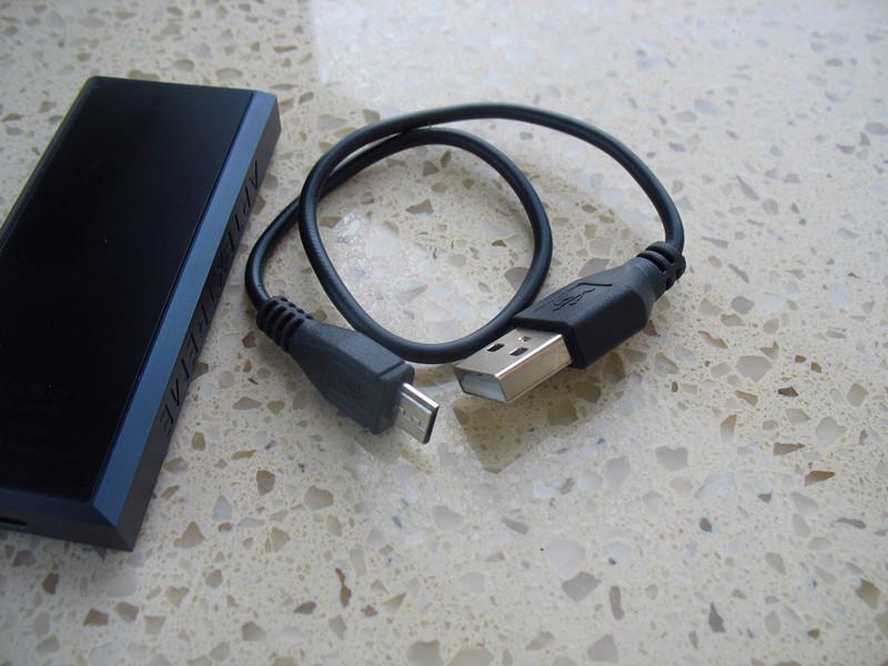 在包装盒内,厂家配送了一条USB充电线,但是并没有充电头,不过目前所有手机的充电头基本通用,直接使用它们进行充电即可。根据官方的信息,雅特斯R1蓝牙耳放内置容量为380mAh锂聚合物电池,待机时间超过240小时,连续听歌可以达到26小时。怎么形容呢,简单来说,就是充电半小时,可以使用一星期。