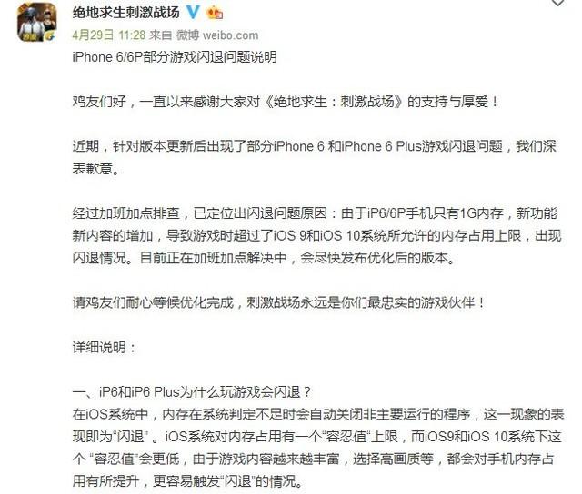 相信最近关注手机圈和手游吃鸡的朋友肯定都看到过这个新闻:iPhone 6/Plus玩刺激战场无限闪退。后来@绝地求生刺激战场发布了微博告知了原因:部分iPhone 6和iPhone 6 Plus游戏闪退问题,主要是手机内存只有1GB的问题。虽然这个问题官方称会在后续的更新中解决,但是无疑也是给了广大iPhone 6用户一个警钟,长达四年的使用时限已经到头了,吃鸡闪退仅仅是一个开始,后续的手游可能会越来越先进,所占用内存也越来越大,趁早换部旗舰大内存手机才是最为重要的。