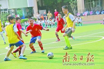 天河区华融小学位于寸土寸金的核心城区,操场跑道长度仅有约150米,却成功申报为全国青少年校园足球特色学校。学校通过足球文化节等形式,让学生了解足球,让家长支持学生参与足球运动。除了多维度的校内足球赛事外,华融小学的足球文化还体现在足球场以外,足球记者、裁判、解说、拉拉队、赛事组织者……多样的角色设置,让全体学生投入到校园足球活动之中。