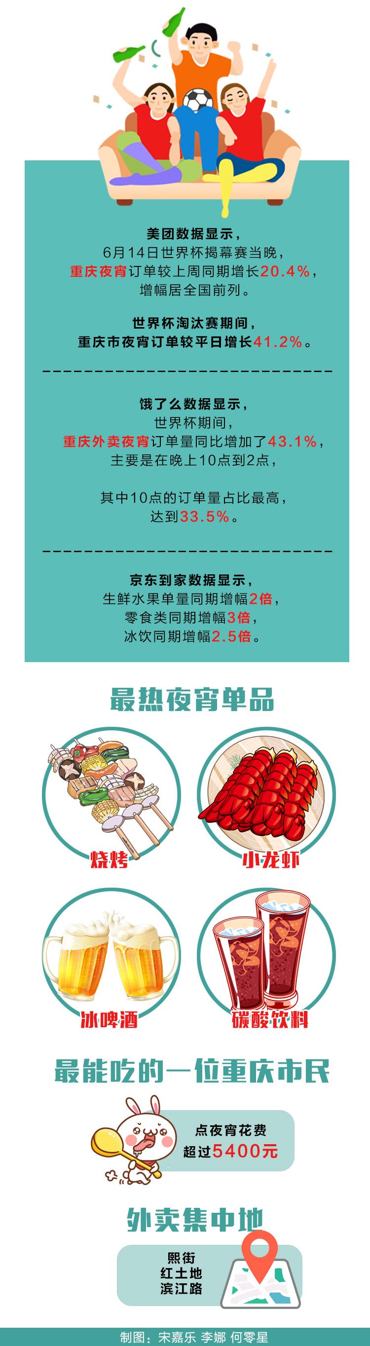 看球当然免不了吃吃喝喝,这也让商家累并快乐着。来自外卖平台的数据显示,重庆人在世界杯期间夜宵订单量大幅增加,增幅居全国前列。