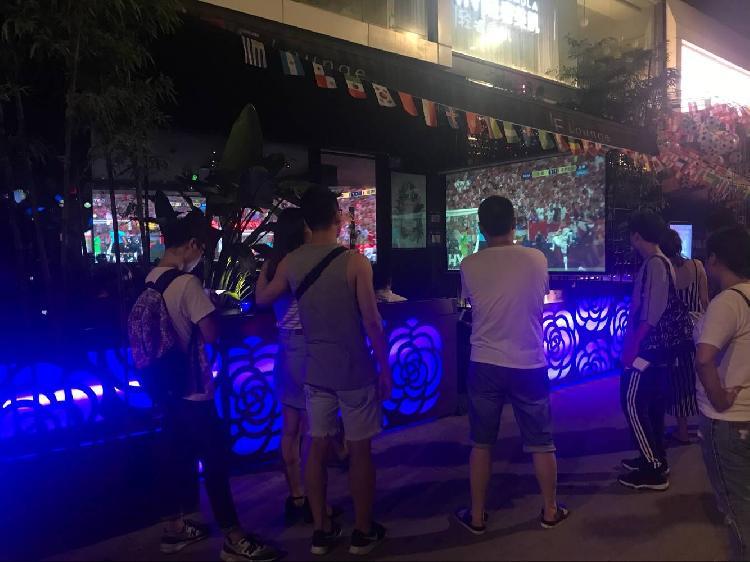 自世界杯开赛以来,市内大街小巷的烧烤店、龙虾店、酒吧都热闹起来,一些餐厅挂起投影大屏幕,供球迷边喝酒边看球,甚至推出了免费喝、球迷大优惠等促销活动。