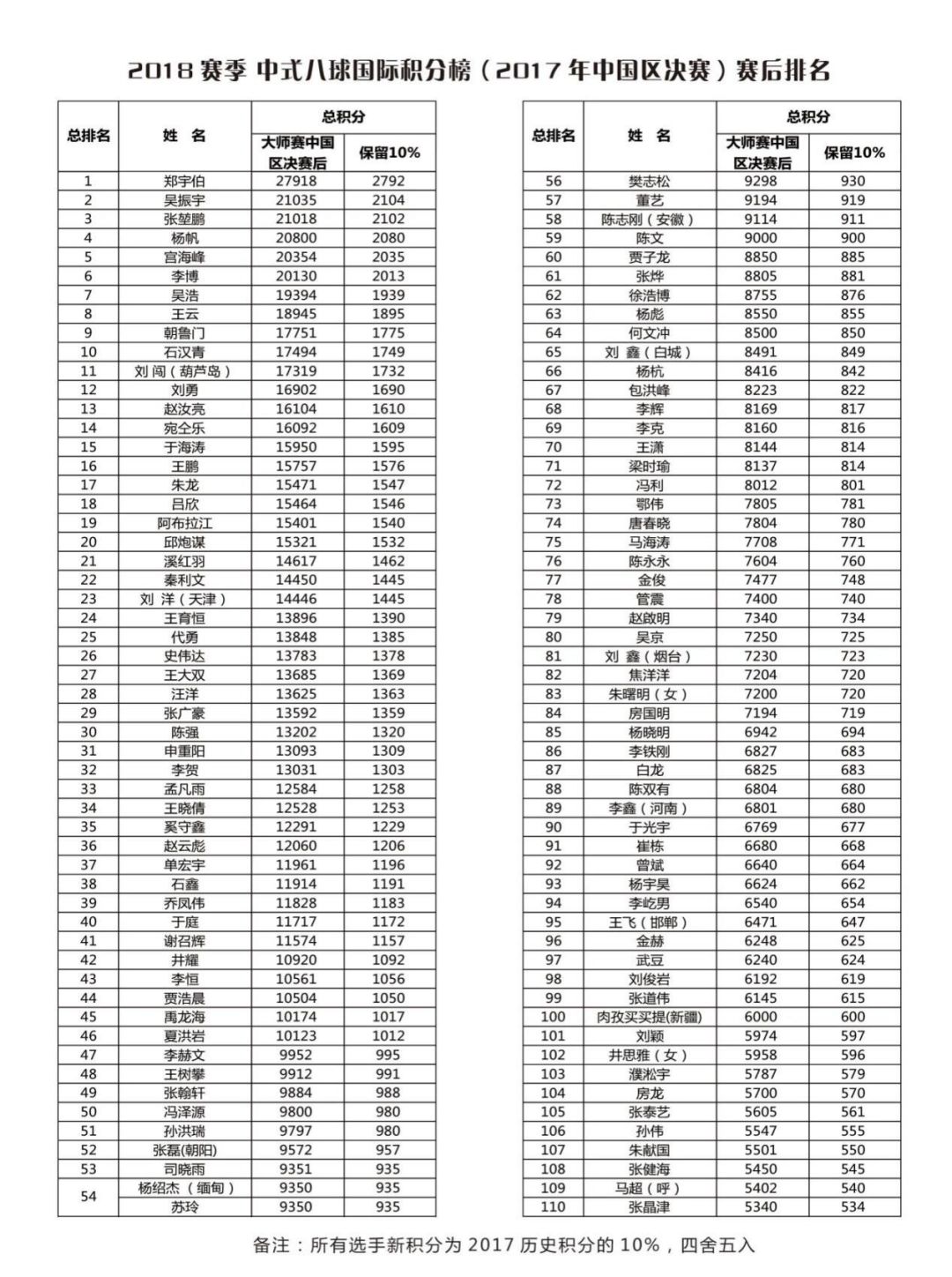 2018-2019赛季全部分站赛结束后,本赛季年度积分(不包含历史保留积分)第一名的选手,直接获得进入中式八球国际大师赛年度总决赛的资格。
