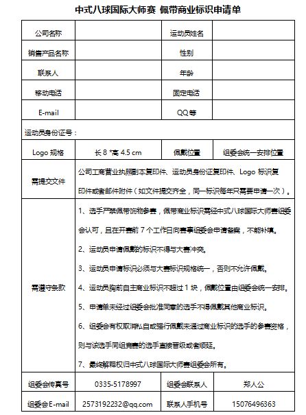 选手佩带商业标识需经赛事组委会认可,且需在开赛7天前向赛事组委会申请备案,组委会有权决定大赛期间裁判员、参赛选手胸前标识内容及形式。运动员胸前自主商业标识数量不超过1块,标志位置由赛事组委会决定。