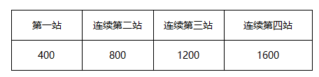 出场分:实际到场参加比赛的选手,按连续参加站次,每站递增400分。