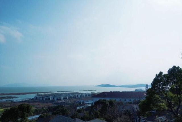 走到室外又是另外一番景象了:不远处的太湖与天空相连,湖天一色,美不胜收。