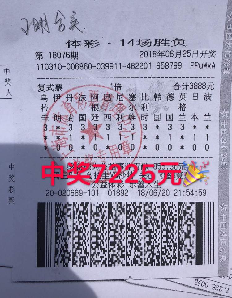 今天先看一张14场胜负彩的单子。这是一张店里胜负彩18076期的合买单,竞猜的是世界杯小组赛第二轮的14场比赛,命中1注一等奖和13注二等奖,奖金7225元,有接近一倍的中奖回报率。做单者表示:“我这张彩票其实还是带有点感情色彩,尽管体育无关政治,但我还是不希望小日本赢球,做了双选。德国瑞典这场我是包掉的,现在复盘,想想还是挺可惜的。包括巴西这场要不是补时胜出,奖金更高。当然重在参与,能中奖还是很开心的。”