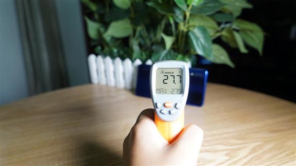 于是笔者选取了一个室温恒定在25度的测试环境,在待机状态下测得机身背面温度为27.7度。