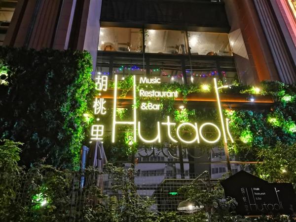 路过酒吧,拍摄其门头,所得样张效果几近完美。绿植颜色随光影有序过渡,“胡桃里”等灯饰文字丝毫没有过曝,稳妥还原其本来面貌,所见即所得。
