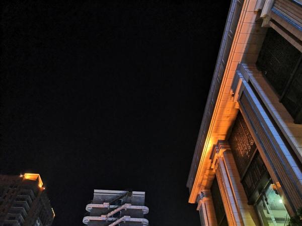 开启超级夜拍模式,所得图像有所好转,天空纯净许多,但三栋楼体当中的中间那栋白色小楼出现了稍明显的涂抹及噪点。