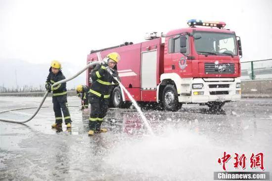 2018年1月27日,持续两天的降雪致使大量车辆滞留义乌后宅收费站,当地消防立即组织官兵前往现场进行破冰除雪工作。中新社记者 何志超 摄