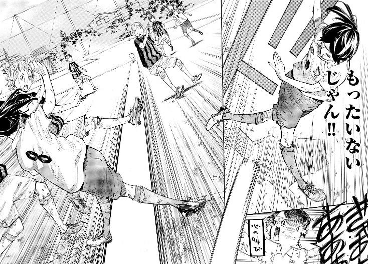 不仅是射门描写得十分有吸引力,新川老师对瞬息万变的球场描写也是下足了功夫。在之后与浦和邦成一战中,恩田独自持球被破坏,后来跟上的周防等人以及回防的浦和邦成球员、一个个从跌倒在地的恩田与桐岛身旁经过,跑在最后的曾志崎还不忘怒斥恩田一句,赛场上大家拼搏、队友间细腻的感情尽显无疑。