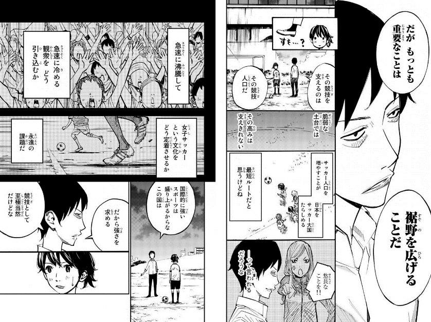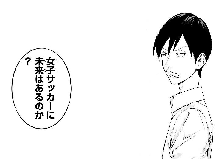 在取材时,新川老师一行人遇到职业球探,对方在挖掘人才时会如此邀请:“在日本发展是没有未来的,毕业后不打算去美国看看吗?”而俱乐部方面,即使是在职业联盟签署了合同的女运动选手,也有仍在收银台兼职的情况。没有观众,商业价值偏低,放眼全世界范围,女子足球的情况都不容乐观。在这样的前提下,女子足球为了得到国家层面的支持,对于“成绩”的需求是十分巨大的。在漫画开篇,也有这样的一页,是一名选手接受媒体采访时坦言道:“如果输了的话,日本女子足球就要完蛋了。”