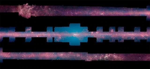在这个项目中,斯皮策的红外观测功能再度发挥了作用,因为在广袤的银河系中,无处不在的尘埃往往会阻挡可见光,以至于大部分地区都无法观测。红外光能比可见光更好地穿透尘埃区域,揭示后面的隐藏部分。利用斯皮策的数据,科学家们更好地了解了银河系螺旋结构和中心恒星“条”的分布。