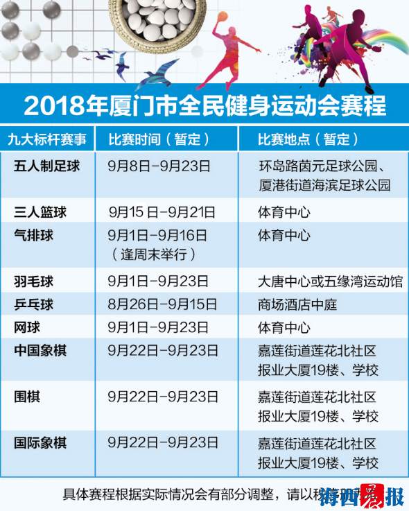 据悉,本届全民健身运动会共设置9个比赛项目,分别是五人制足球、三人篮球、气排球、羽毛球、网球、乒乓球、围棋、中国象棋、国际象棋。值得一提的是,组委会设立了高达42.6万元的总奖金。