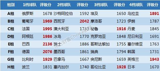 各组情况中,东道主俄罗斯所在的A组平均实力分最低(1703分),且强弱差距较大,乌拉圭是该组的热门球队,俄罗斯和埃及紧随其后;