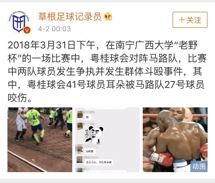 今天,1003听众爆料:3月31日下午,在广西大学“老野杯”的一场比赛中(粤桂球会对阵马路队),两队球员发生争执并发生群体斗殴事件。其中,粤桂球会41号球员耳朵被马路队27号球员咬伤。