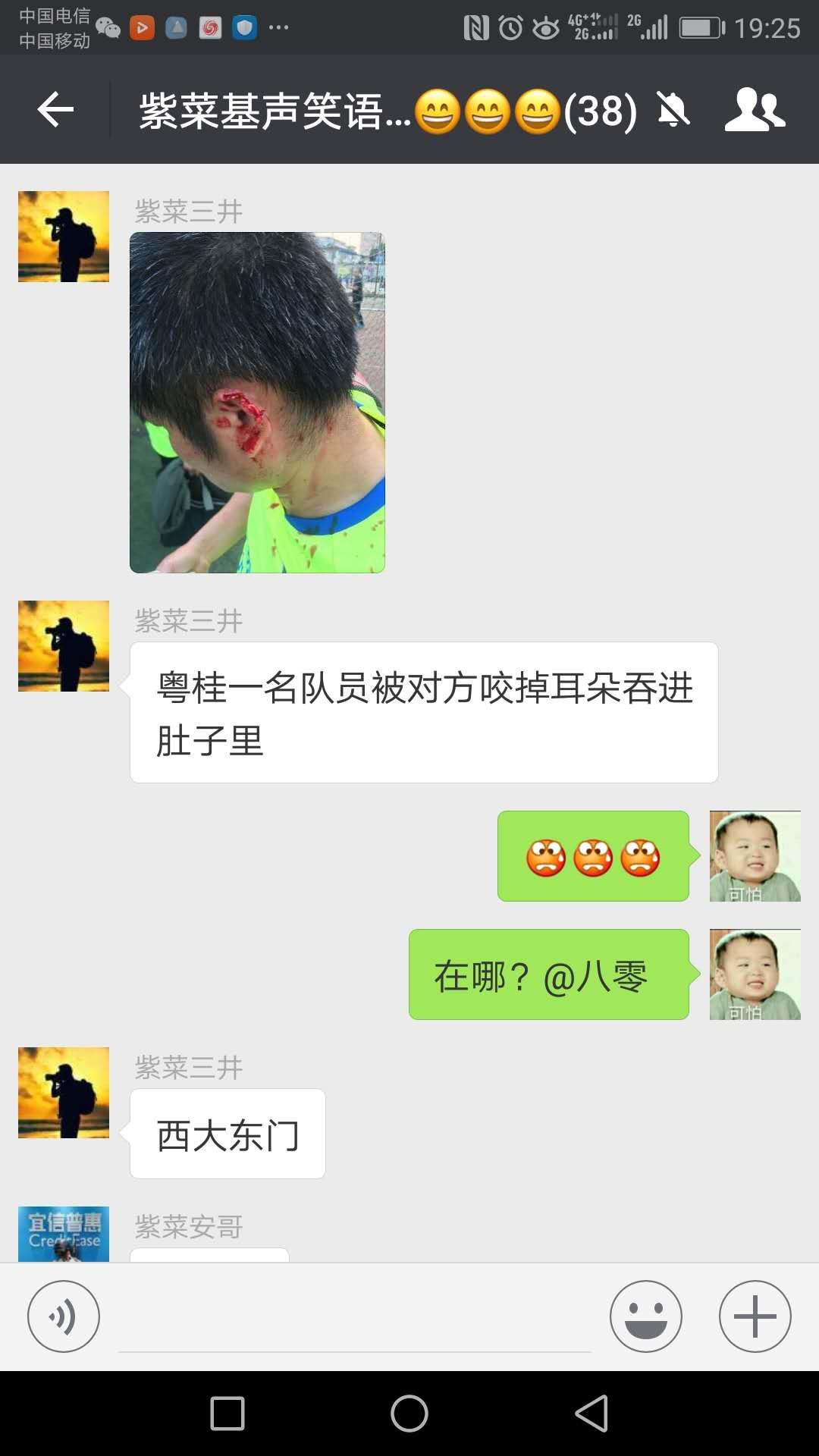 一名微信名为“紫菜三井“的网友称:粤桂一名队员被对方咬掉耳朵,还吞进了肚子里!