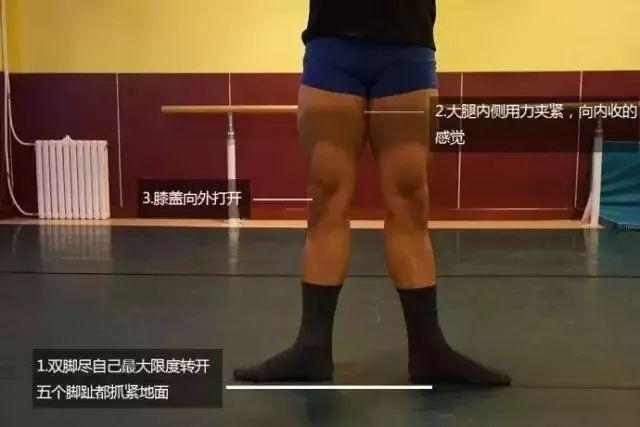 2.膝盖弯曲缓缓下蹲,膝盖缓缓蹬直双膝向内用力夹。下蹲时膝盖外开,脚后跟不要离开店面)