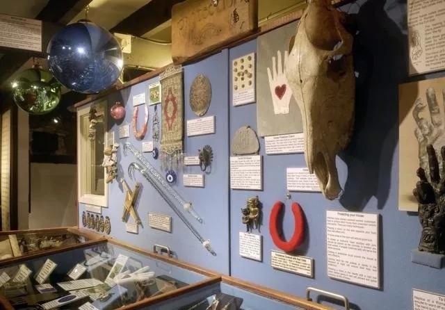这里展示了许多巫师施展法术所需的物品。有画着各种符号的巫书,传说中的吸奶怪物,还有装着人血的玻璃瓶……