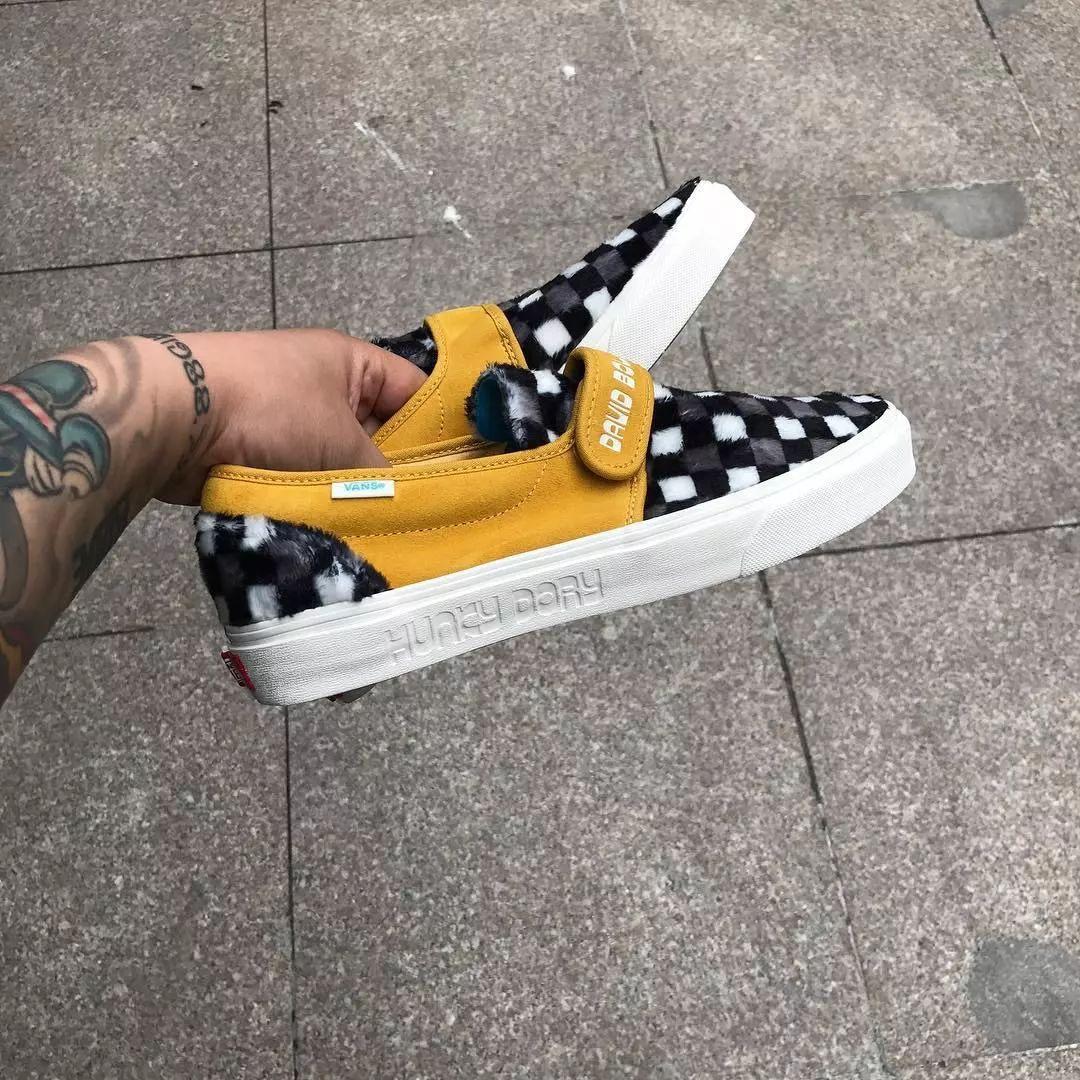 David Bowie x Vans Slip-on 联名鞋款曝光 IG用户 @dirtymoney823 近日曝光了全新 David Bowie x Vans Slip-on 联名鞋款。此次鞋履采用 Vans 经典鞋型之一 Slip-on 作为基底,整体配色以毛绒材质格纹搭配磨砂皮革姜黄配色,值得一体的是,鞋款侧部延伸出的魔术贴设计体现其鞋款的独特设计,而魔术贴处以及鞋侧面外延都带有 David Bowie 标志性 Logo 以表此次的联名身份,不过目前还未明确发售时间。