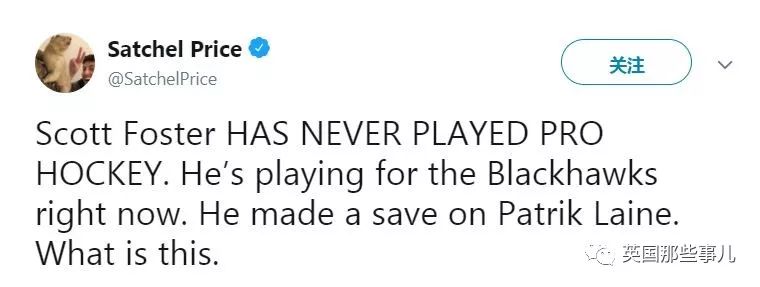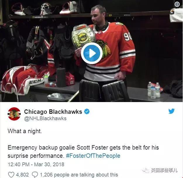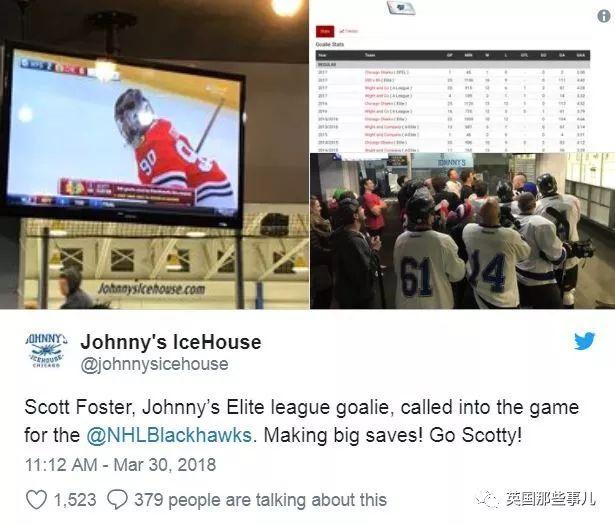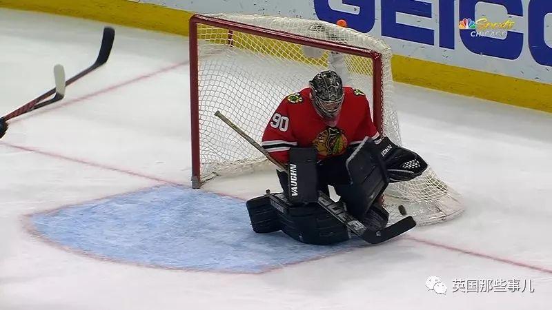 “Scott Foster可是一个从未参加过职业冰球比赛的人!他在为黑鹰队大比赛!他从Patrik Laine(喷气机球员)手下救了一球!这是什么情况!”