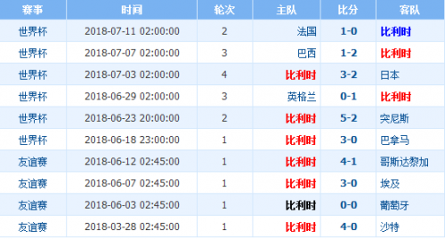 比利时世界杯小组赛排名G组第1出线,相继淘汰日本和五星巴西,但不敌法国,本场取胜*率赔**2.21。比利时本届世界杯场均攻入2.3球为所有球队之最,而英格兰自小组赛以来仅零封了进攻实力不强的瑞典。比利时主力边翼卫穆尼耶本场解禁复出,预选赛他缺席的2场比赛球队仅打入3球,而出战的8场场均攻入5球。比利时近10次世界杯对阵欧洲球队3胜4平3负不占上风,小组赛赢下英格兰也皆因后者想进下半区。