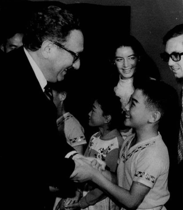 1974年,中国武术代表团访美,基辛格与小演员握手。
