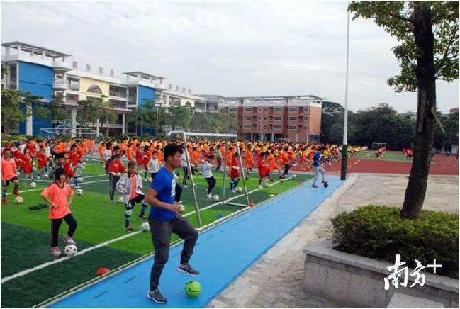 该校足球教师、曾在恒大足球俱乐部任职的彭修张表示,学校探索开展了普及性足球课、足球大课间、建设梯队(班级队、年级队、校级队、教师队、家长队)、开发了足球特色课程、搭建了完善的足球竞赛平台。同时,学校也配备了出色的足球场地,可以同时能满足足球教学、足球大课间、足球比赛等多项需求。