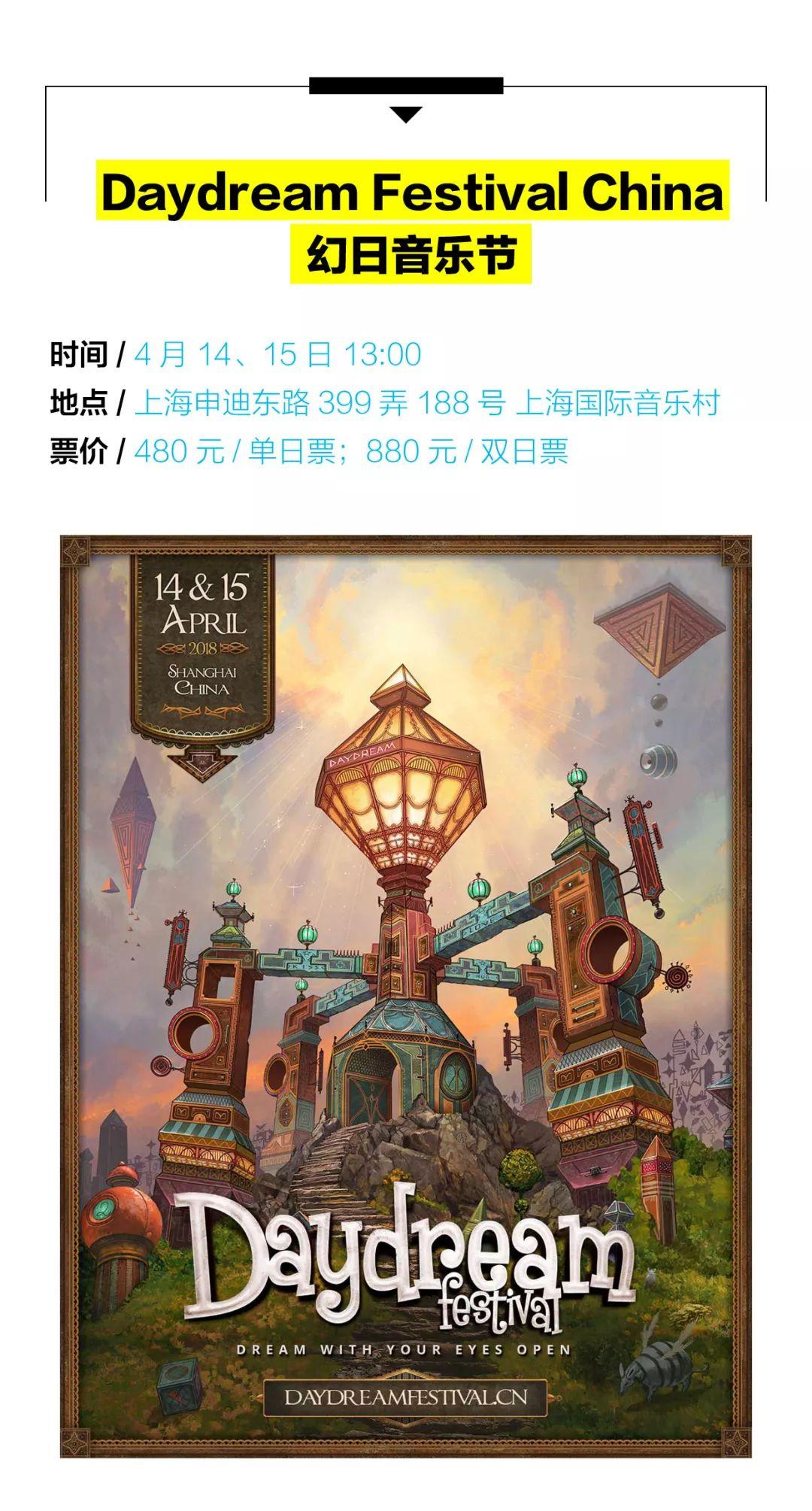 源自童话王国比利时的Daydream幻日音乐节也将在今年4月登陆上海,该音乐节正如它的名字一般,以极具梦幻华丽的意景和气氛著称,先锋性地将戏剧艺术、嬉皮文化、时尚潮流完美融入音乐嘉年华式体验中,Daydream幻日音乐节真正诠释了音乐节的真谛:拥抱生命,融化隔阂,寻找真我。作为首站,这场盛典将融入“Dream With Your Eyes Open”的核心理念,汇集超过51组国际顶尖艺人,用标志性的戏剧感梦幻布景为你打造一个色彩斑斓的音乐绮想仙境。