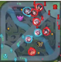 之后又是项羽+娜可露露一路压兵线,大乔花木兰另一边准备开暴君,百里守约守中路塔。项羽那边压好兵线之后,大乔开大,集合拿暴君。拿完暴君项羽娜可露露组合再压另一路兵线。认准 EDG.M 阵容必须野辅再带一个边路抱团才能杀人的节奏,BA 利用这种212 的阵型始终保持对双边兵线的压力。让EDG.M 的打架阵容非常难受,东皇太一失去了线上强开的节奏。
