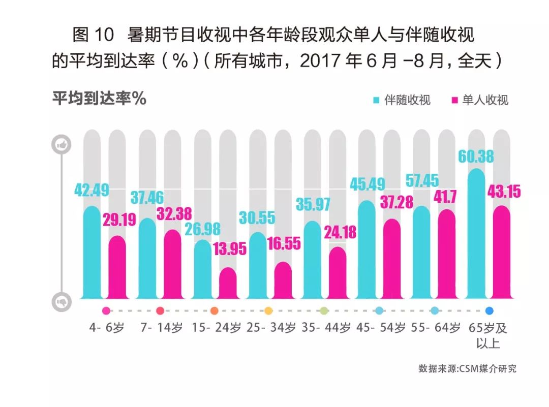 以2017年暑期节目为例,4-6岁儿童对遥控器的操控能力较差,因此每天与家庭成员相伴收视的儿童比例达到所有4-6岁儿童的42.49%,而单独收看电视的4-6岁儿童仅为4-6岁所有观众的29.19%。随着年龄的增长,7-14岁少年观众对遥控器的操作能力增强,其与家庭成员间相伴收视行为开始减少,伴随收视和单独收视两者占比差异减小。