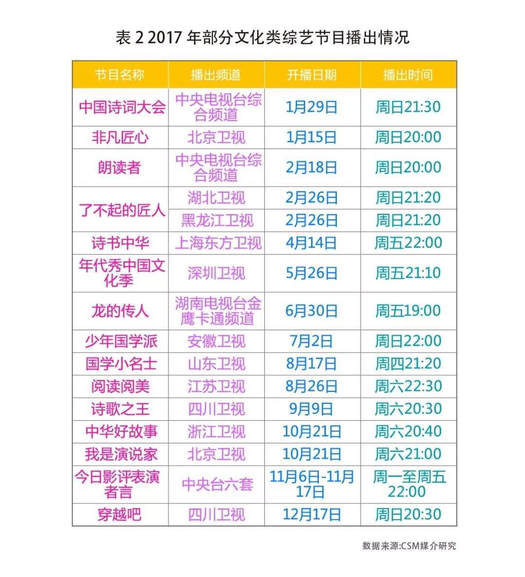 值得注意的是,2017年初央视接连推出《中国诗词大会》《朗读者》等多档文化类综艺节目,掀起一股弘扬传统文化的热潮。随后,各大卫视纷纷推出了《汉字风云会》《向上吧!诗词》《阅读·阅美》《儿行千里》等节目,让文化类综艺成为“一股清流”。