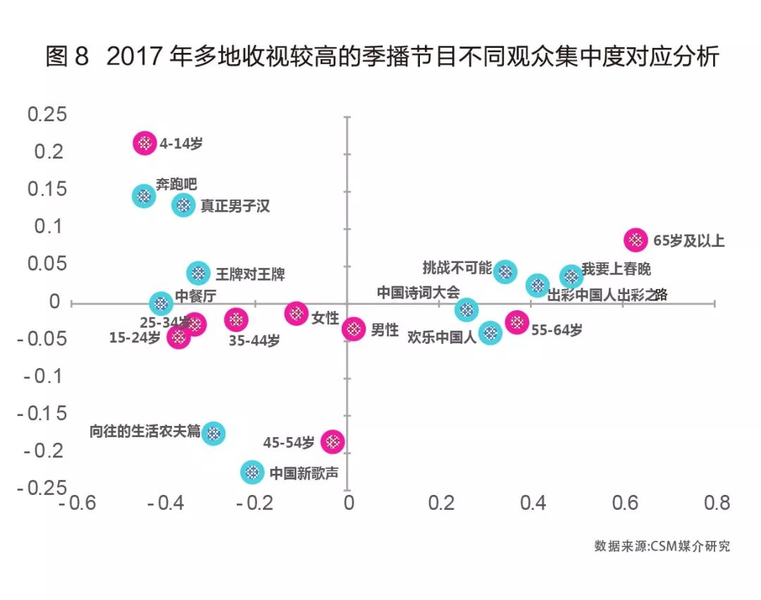 2017年,多地晚间收视较高的季播节目观众集中度对应分析结果显示,观众的个人需求愈加复杂,每个人身上都可能存在多种需求,对节目的喜好也是会随着个人行为轨迹而产生纵横交错的不同场景需求。