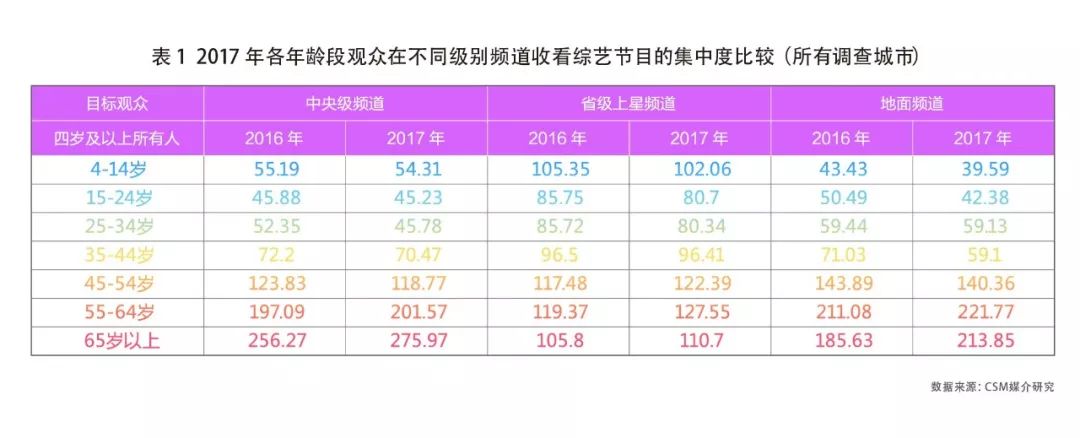 从各年龄段观众综艺节目集中度来看,各级频道组综艺节目形成差异化的受众定位。与2016年相比,2017年龄在44岁及以下观众收看综艺节目的集中度均有不同幅度的减少,其中年龄越小,对综艺节目的喜好度降幅更大。