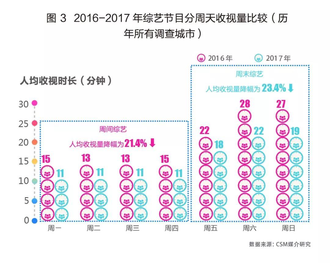 2、综艺市场竞争激烈,周末收视量降幅更明显