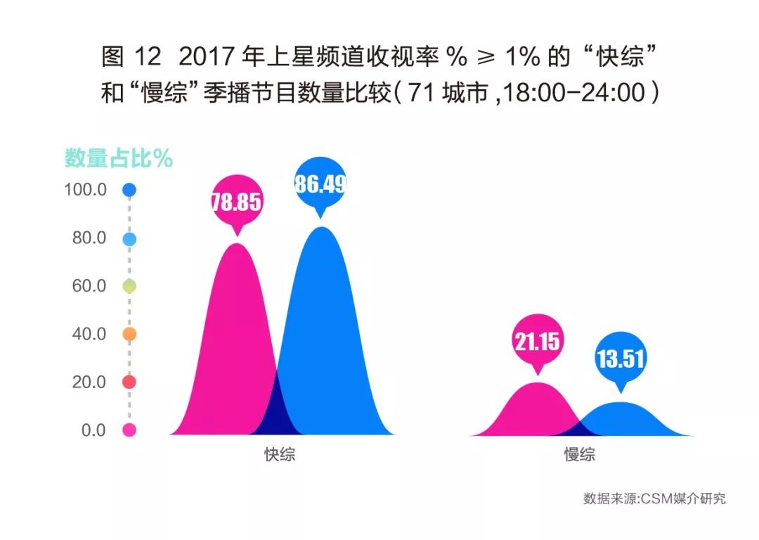 虽然与2016年相比,“慢综”在71城市收视率过1% 的晚间季播节目中占比下降了近8%,但忙碌的现代都市,闲适的生活已经成为多数人可望而不可即的事情,“慢综”提供了这样寻求慰藉与满足想象的机会,所以“慢综”虽然收视还不像“快综”成为综艺的支撑主力,但在社会上也引起一些反响,有一定的讨论量。