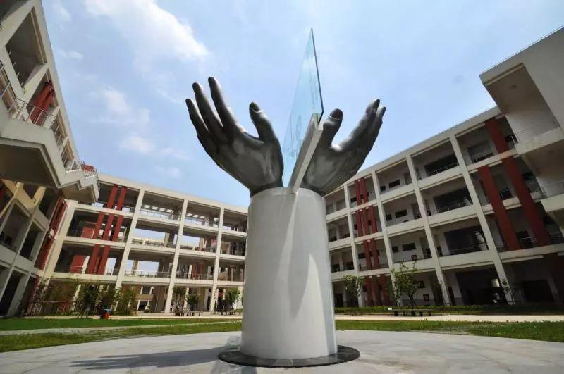在公共教学楼的空地上,座落着一个2米余高的圆柱形基座,上面有一对硕大的金属手掌左右相对分开,中间隔以一块透明的长方形钢化玻璃。这又有着什么寓意呢?