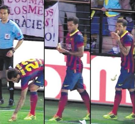 还有个著名的事件,几年前,在巴萨和比利亚雷亚尔的西甲联赛中,当巴萨球员阿尔维斯准备主罚角球的时候,看台上一位比利亚雷亚尔的球迷竟然将一根香蕉扔到阿尔维斯身边,显然这个举动是赤裸裸的种族歧视行为。