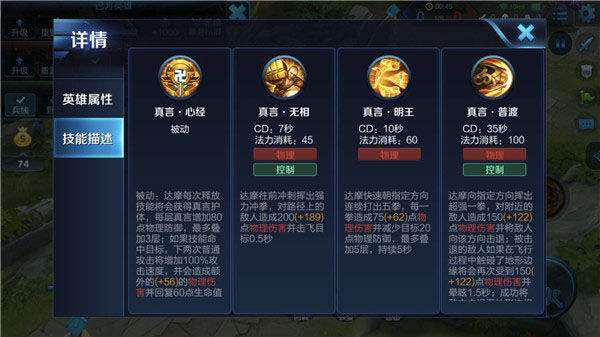 达摩每次释放技能将会获得真言护体,每层真言增加80点物理防御,最多叠加3层;如果技能命中目标,下两次普通攻击将增加100%攻击速度,并会造成额外的(+30%物理加成)的物理伤害并回复60点生命值