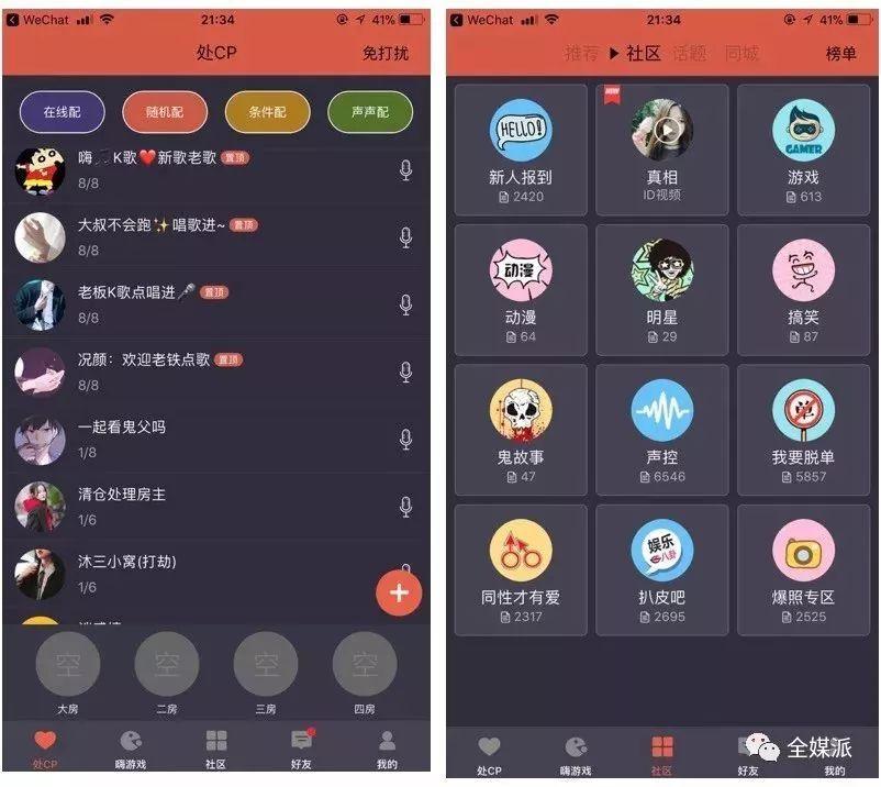 与此同时,00后的社交互动也渗透到到了“恋爱”主题上,“隔壁同学”、“处CP”就是00后用户较多的“恋爱社交”APP产品,用户可以在里面和多人同时结成线上情侣关系,执行恋爱任务,包括“真心话大冒险”、“你画我猜”等,同时它们也设有“社团”模块,用户可以基于兴趣进一步社交。