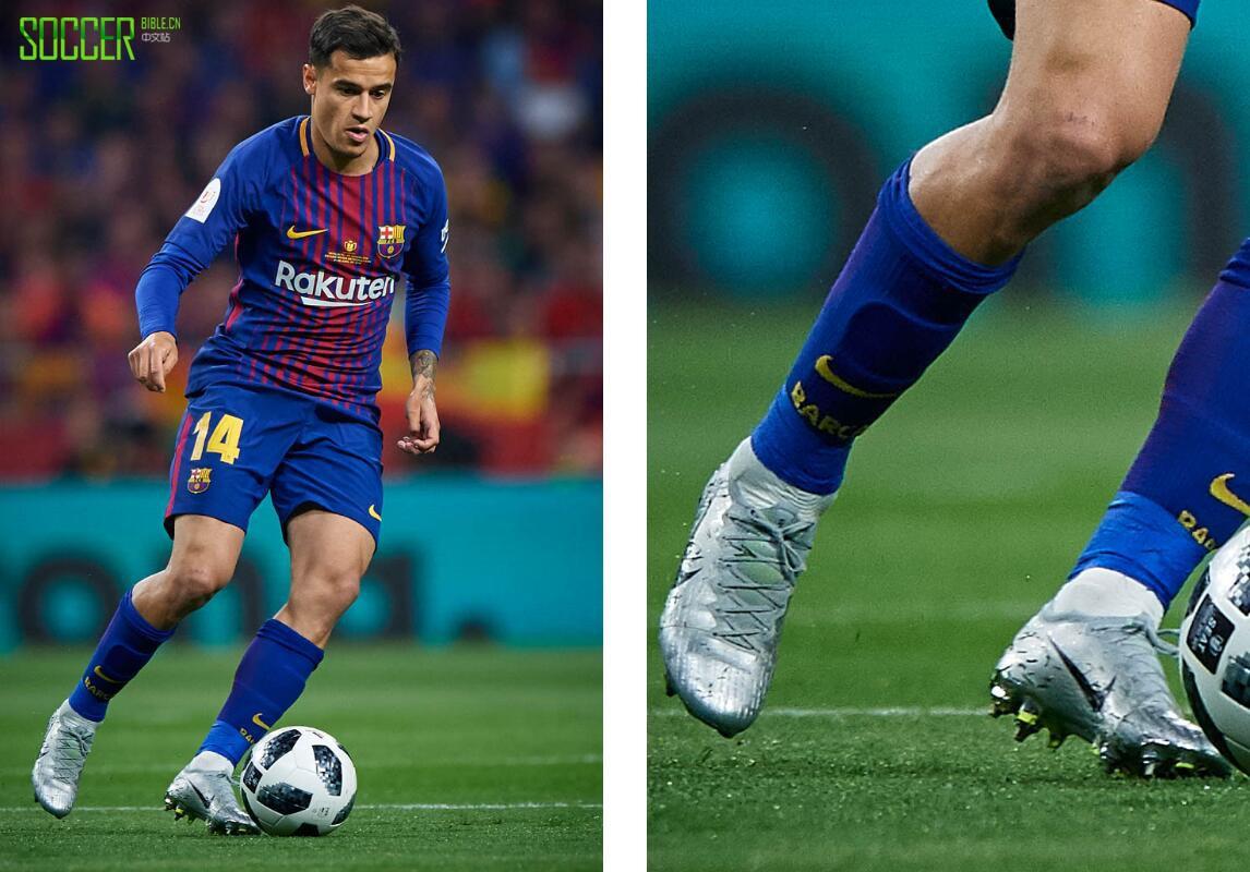 登贝莱在巴萨的队友,库蒂尼奥也换上了新的Vapor 360,这款配色反映了2002年日韩世界杯上耐克赞助球员们的第一款银色设计的刺客Vapor。那届世界杯上,巴西笑到了最后,这也是库蒂尼奥本周穿上这款战靴的原因。