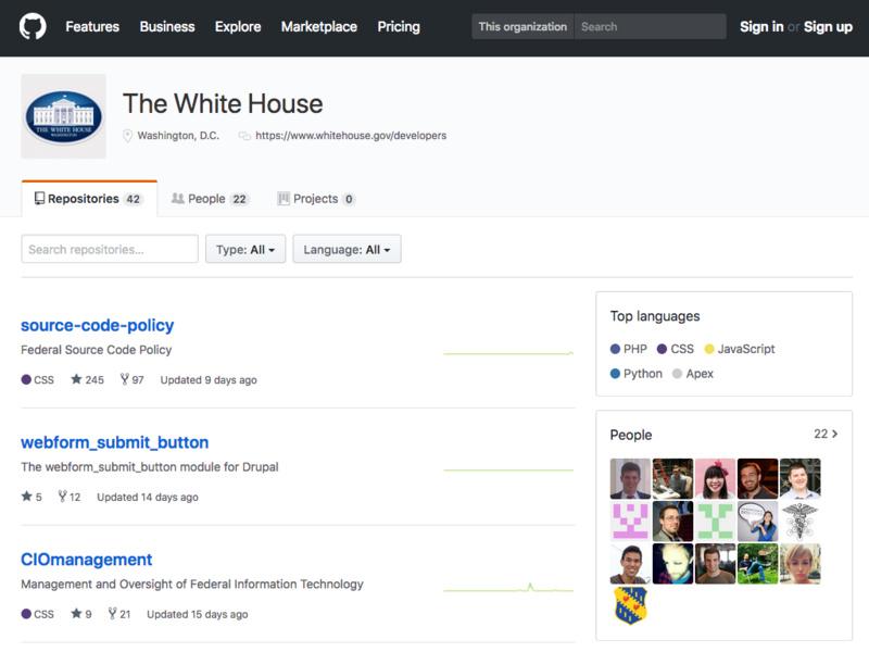 GitHub不仅仅在慢慢吞噬硅谷,它也蔓延到了华盛顿的政府领域。2013年5月9日,白宫在GitHub 上发布了美国官方的“公开数据政策”(Open Data Policy)草案。与GitHub上百万个存储库中托管的代码项目相比,文件本身的效用有限,但它具有非常重要的象征意义。在私人公司的服务器上对外托管政府政策文件是闻所未闻的。