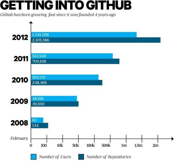 GitHub继续吸引着大量的用户加入。截至2011年底,GitHub已经托管了200多万个存储库,在用户和提交方面都超过了SourceForge、Google Code和微软的CodePlex。与之前的Organizations一样,GitHub Enterprise的发布也传达了该公司的意图,即成为大型科技公司和个人程序员不可或缺的地方,这是该公司在2012年至2015年间积极推进的战略方向。