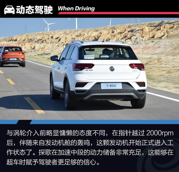 由于轴距加长了85mm,相对于海外版标轴车型较轻盈的车身,探歌在动力方面将不可避免的存在劣势,但即使如此,1.4TSI发动机还是尽职尽责的发挥了自己的能力——其对于油门踏板的反馈颇为灵敏直接,而探歌也由此获得了充沛的低扭表现。