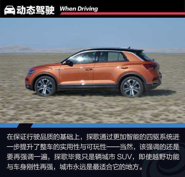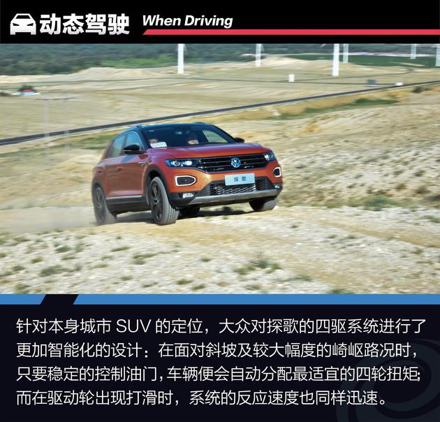 与通常配备适时四驱系统的城市SUV不同,大众为探歌提供了除三种常规驾驶模式外的一种雪地模式与两种越野模式,对比其它配备适时四驱系统的城市SUV来说,探歌对“专业性”的表现要更讲究一些,而对比那些配备全时四驱或分时四驱的硬派越野车来说,探歌又更加智能,操作更“傻瓜化”一些。