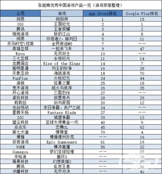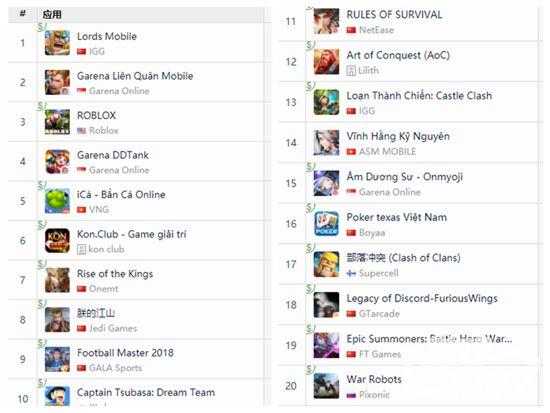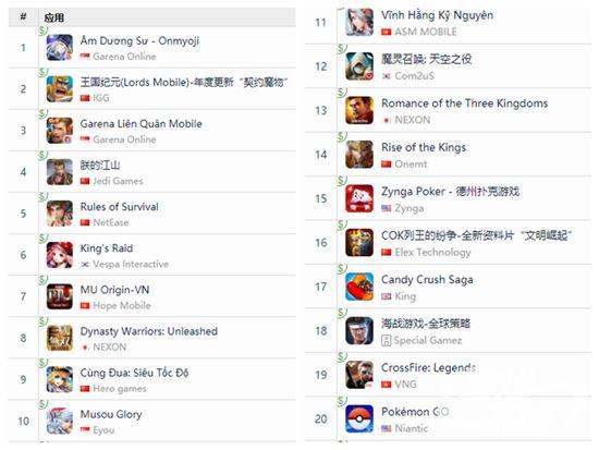 在越南App Store畅销榜上,《阴阳师》排名第一,《王国纪元》排名第二,《王者荣耀》排名第三。《朕的江山》新年以后在多国发力,这次排名了越南畅销榜第四,网易的《终结者2:审判日》排名第五。《King's Raid》、《全民奇迹》和《真三国无双:释放》分列第六至第八。英雄互娱的新游《一起来飞车》排名第九,《无双剑士》名列第十。