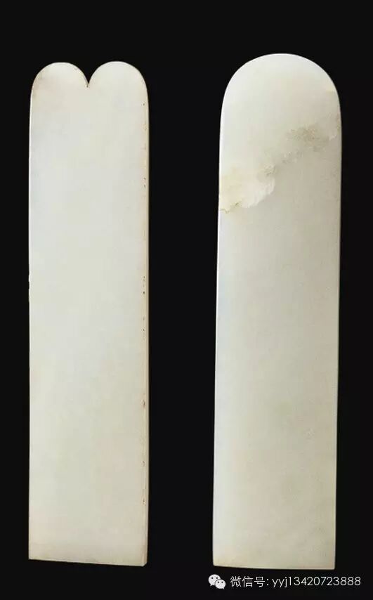 和田白玉,玉质滋润,体扁长形。其一上端圆弧,下端齐平,有撞璺,另一上端凹陷,下端齐平。器表中间微凸,边缘稍薄,器背平直。
