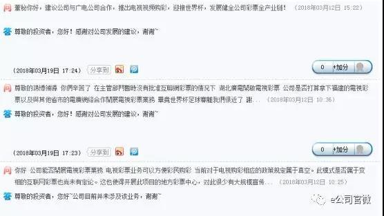 足球赛事自然少不了彩票作伴。小e留意到,近一个月来,投资者频繁询问湖北广电的售彩事宜。